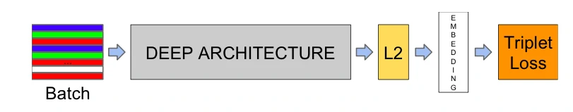 如图所示:Deep Architecture就是卷积神经网络去掉sofmax后的结构,经过L2的归一化,然后得到特征表示,基于这个特征表示计算三元组损失。