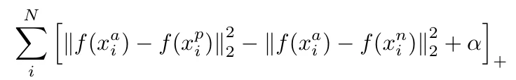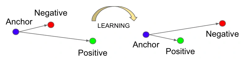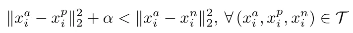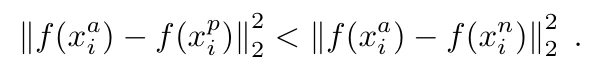 所谓的三元组就是三个样例,如(anchor, pos, neg),其中,x和p是同一类,x和n是不同类。那么学习的过程就是学到一种表示,对于尽可能多的三元组,使得anchor和pos的距离,小于anchor和neg的距离。即: