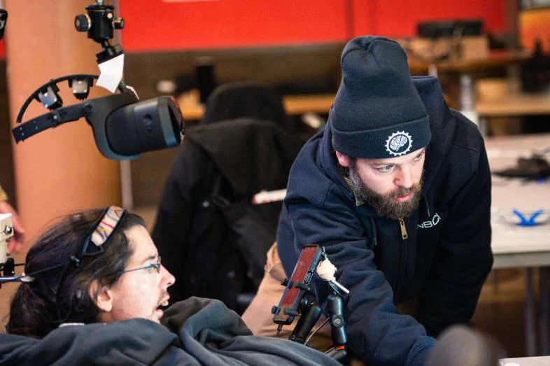 克里斯蒂安与OpenBCI团队合作,确定了他能稳定激活的四组面部肌肉,在这些肌肉上贴好传感电极。OpenBCI的硬件和软件将每个肌肉群的激活转换成数字滑块的移动。再经过信号处理和微调,减少误报,并让滑块的灵敏度完美适应克里斯蒂安本人。然后,这些滑块被映射到全新的数字操纵杆上。