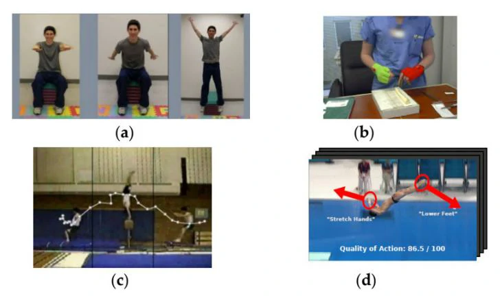 人体动作评估的几个重要应用领域:(a)医疗保健和康复; (b)专业技能训练; (c)运动技能训练; (d)体育活动评分