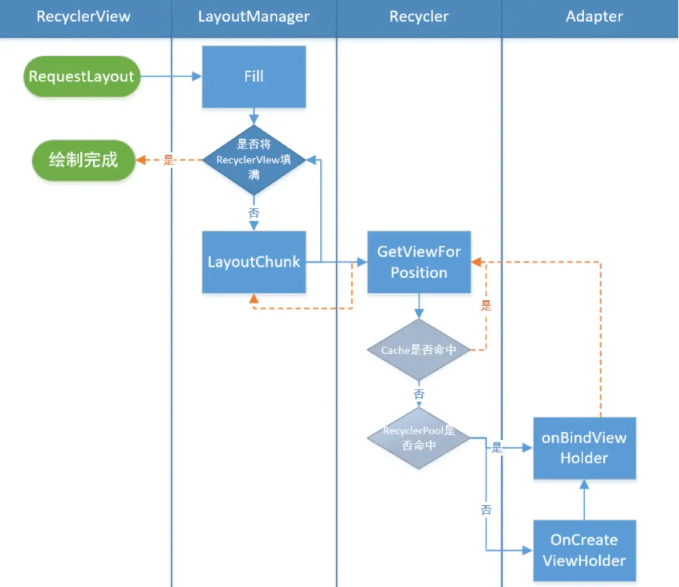 RecyclerView.requestLayout();是驱动列表刷新的源头,该方法会从根视图自顶向下进行重绘。RecyclerView的重绘表现为重新布局所有表项。