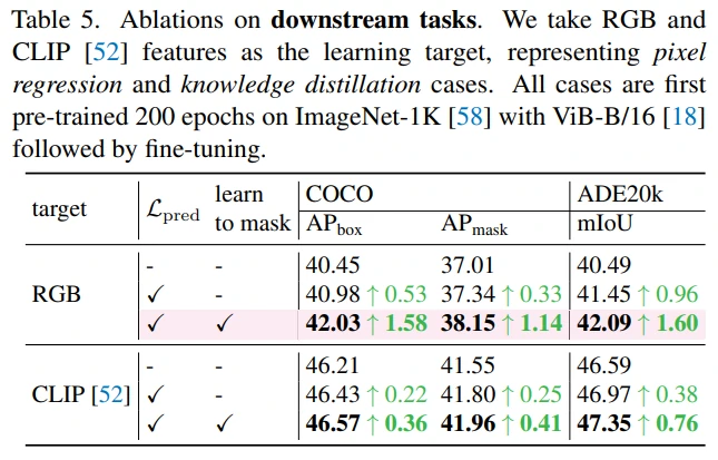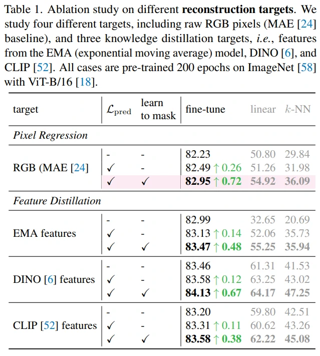 重建目标的消融。我们发现,不管以什么为重建目标,加入 L_pred 作为额外的损失,并基于此进一步产生更难的代理任务均能获得性能提升。值得注意的是,仅仅引入一个额外的 objective 也能够带来 consistent 的性能提升,表明挖掘困难样本的能力本身,就能够促使习得更好的特征表示。这一点不仅在分类任务上得到体现,下游任务(检测分割)也有相应的体现。