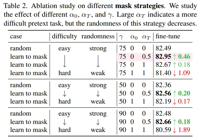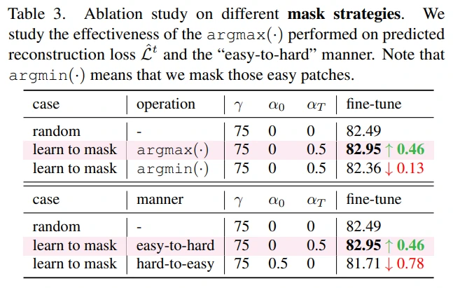 进一步地,我们探究「难」的代理任务对于 MIM 是否有帮助。其中,argmin 表示这个任务甚至简单于 random masking,会导致性能退化。类似的,hard-to-easy 也会导致性能退化。