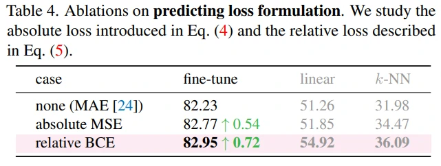 预测损失的 formulation。MSE 相较于 baseline 能够有提升,但 BCE 是一个更好的选择。