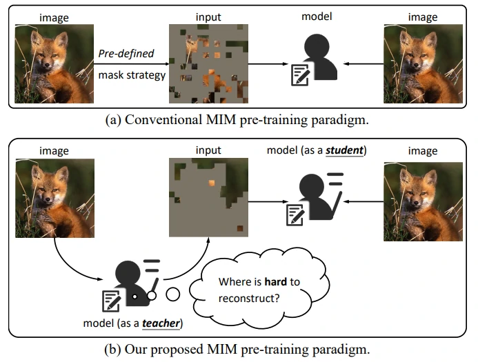 在典型的 MIM 方法中,模型通常专注于预测 masked patches 的某一形式的 target (例如 BEiT[1]的离散 token,MAE[2] 的 pixel RGB)。而由于 CV 信号的稠密性,MIM 方法通常需要预先定义的掩盖策略,以构造具有挑战性的自监督代理任务。否则,一个简单的插值就能完成对于 masked patches 的重建。总的来说,整个 MIM 的过程可以被认为是训练一个学生(模型),解决给定的问题(重建 masked patches),如上图 (a) 所示。