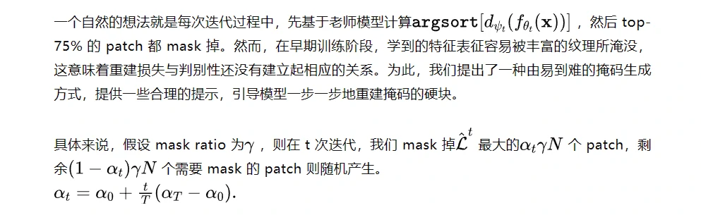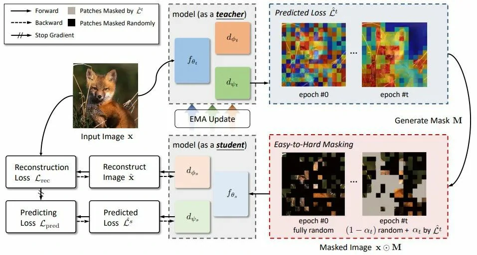 具体来说,给定一个输入图像,我们不是在人工设计的标准下生成一个 binary mask,而是首先让模型作为一个老师,自主产生掩码;然后像传统方法一样,让模型作为一个学生,让它重建 masked patches。