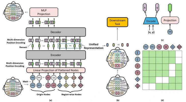 本文的模型骨干部分训练和基于Transformer的编码器-解码器作为掩码自动编码器模式相似。但相较于传统的直接将各原始通道节点直接放入transformer不同,本文还引入了区域节点/区域标记s∈R17 × D,并将其追加到序列末尾,如图1(a)下方所示。同时为了避免区域节点之间的交互冗余,本文为为编/解码器分配了一个固定的注意力掩码,图1(d)为其中一个例子。通过掩蔽建模的方式,该训练方式迫使模型能对EEG的统一拓扑结构进行良好的建模。