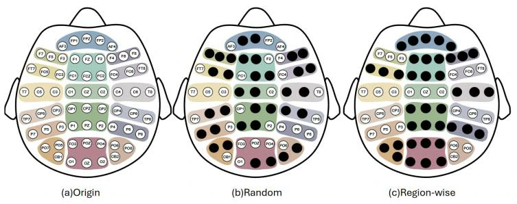 为了让MMM更好的学习到全局信号知识和区域信号知识,本文相应地引入两种掩蔽策略,并在预训练过程中轮流使用。其中全局随机策略掩蔽通道的掩蔽信道数量固定,区域掩蔽策略对同一区域内的通道全部掩蔽或全部不掩蔽,如图2所示。