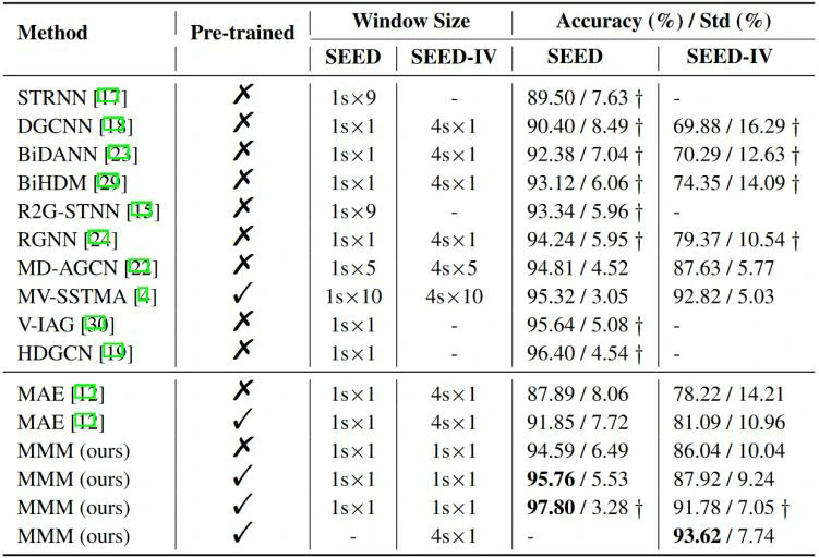 本文在SEED和SEED - IV的被试相关情况下的不同设置下与既定的基线进行了比较,结果如表1所示。窗口大小是构建输入的特征长度。例如,4s × 5表示每个DE特征聚合4秒的原始EEG信号,五个连续的DE特征被用作模型输入。匕首符号代表在计算最终的平均准确率时,每个受试者排除3个中表现最差的会话。