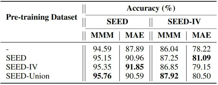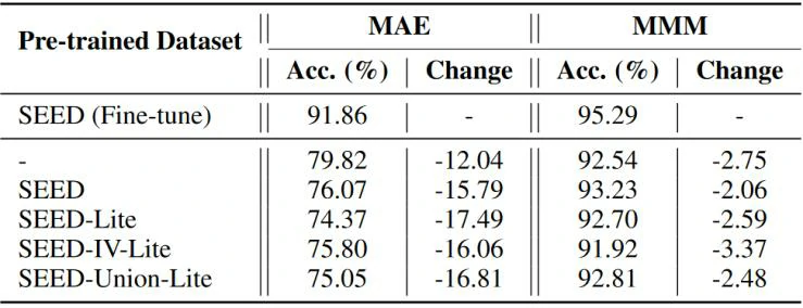 在这一部分中,本文研究了模型在具有相同传感器配置的数据集上的可迁移性。本文在原始数据集上预训练模型,包括SEED、SEED - IV以及它们的组合。随后,在目标数据集SEED和SEED - IV上评估这些预训练模型的微调性能。