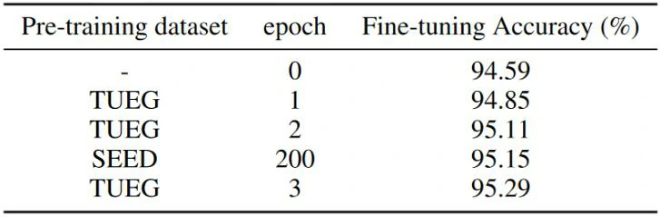 模型在TUEG数据集上进行预训练,( - )表示从头开始训练得到的模型。然后,在SEED数据集上对模型进行微调和测试。鉴于之前的研究发现了本文的方法在不同数据集和蒙太奇中的有效性,接着将方法部署在TUEG数据集上。值得注意的是,尽管TUEG数据集收集了10 - 20系统中涉及21个通道的不同通道配置的数据,但其在预训练中的应用仍然是有益的,如表4所示。