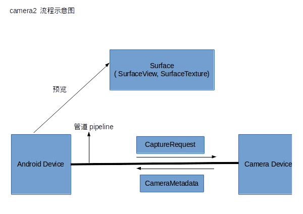 这里引用了管道的概念将安卓设备和摄像头之间联通起来,系统向摄像头发送 Capture 请求,而摄像头会返回 CameraMetadata。这一切建立在一个叫作 CameraCaptureSession 的会话中。