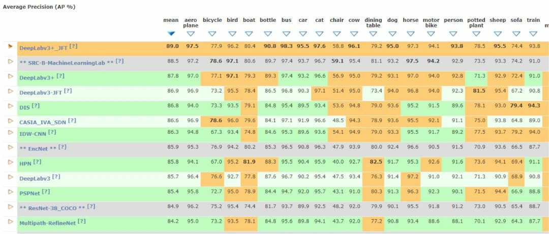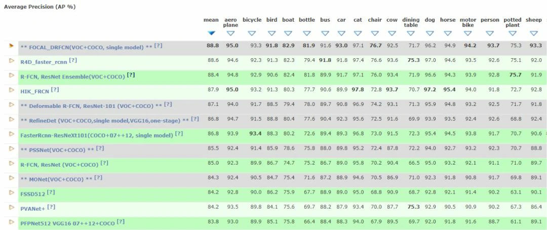 通用目标检测和分割是机器视觉领域非常有挑战性的任务,它要找出图像中各种不同类型的目标(如人,汽车,飞机等),确定它们的大小和位置以及轮廓。由于视角的变化,物体形状和外观的不同,光照的影响,遮挡等因素的存在,这类问题在长时间内没有大的进展。使用深度神经网络的算法在这一问题上也取得了历史性的突破。下表是VOC2012数据集上各种算法的准确率:
