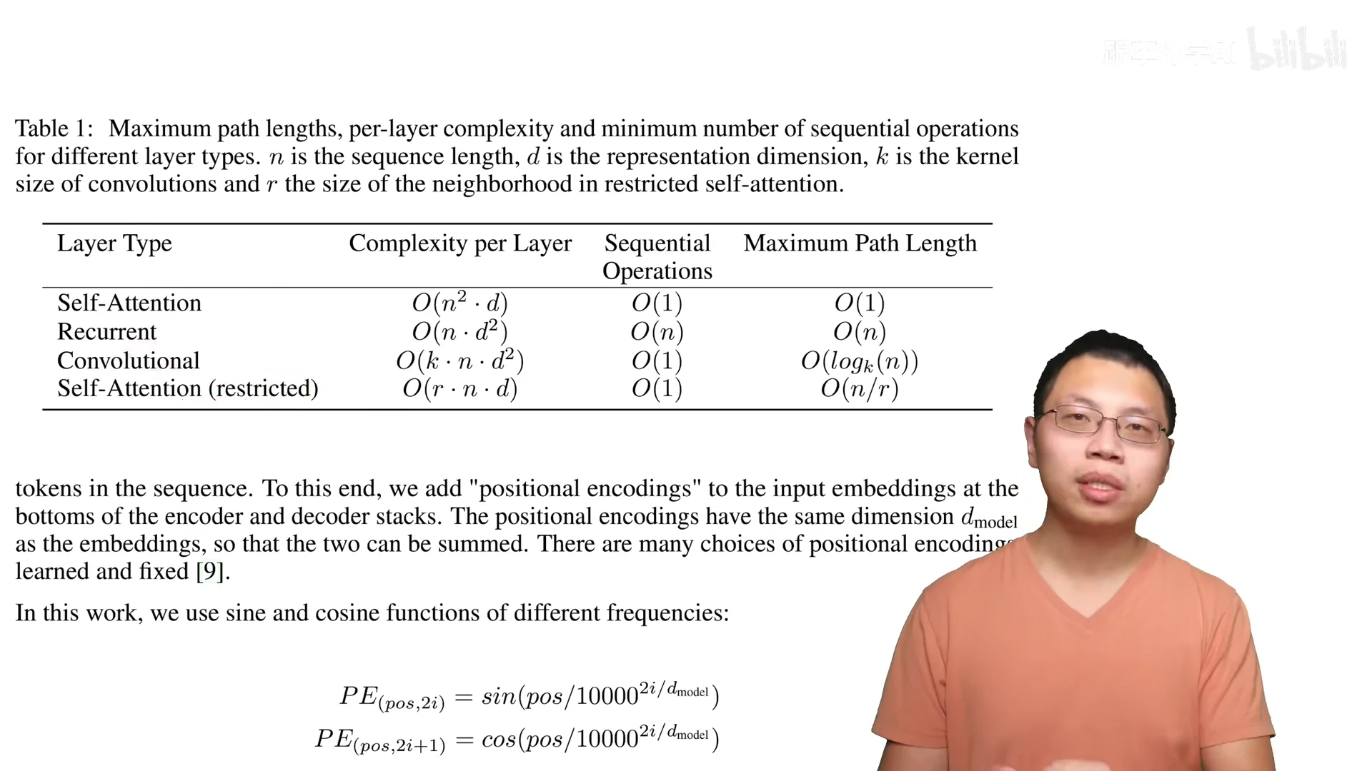 第一个当然是他们关注的自注意力,然后是循环层、卷积层。另外一个是他构造出来一个受限的自注意力,它的有三列作比较。第一列是说我的计算复杂度当然是越低越好。第二个是说我的顺序的计算越少越好。顺序的计算就是说你下一步计算必须要等前面多少步计算完成,再算一个 layer 的时候。你越标的,那么你的并行度就越高啊。