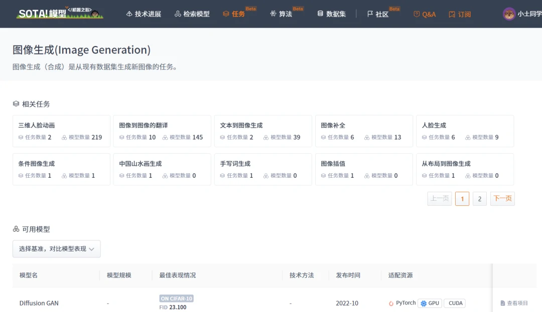 图像生成也是深度学习模型应用比较广泛、研究程度比较深的一个主题,大量的图像库也为SOTA模型的训练和公布奠定了良好的基础。在几个著名的图像生成库中,例如CIFAR-10、ImageNet64、ImageNet32、STL-10、CelebA 256、CelebA64等等,目前公布出的最好的无条件生成模型有StyleGAN-XL、Diffusion ProjectedGAN;在ImageNet128、TinyImageNet、CIFAR10、CIFAR100等库中,效果最好的条件性生成模型则是LOGAN、ADC-GAN、StyleGAN2等。