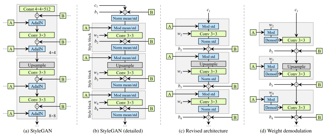 图7 重新设计StyleGAN synthesis network 。(a) StyleGAN,A表征生成style的学习映射变换,B为噪声广播操作;(b) StyleGAN的详细表述,其中,将AdaIN拆分以更加明确归一化操作,两者均基于每个特征图的平均值和标准偏差;(c)StyleGAN2架构,在开始时删除了一些冗余操作,将b和B的添加移动到style的活动区域之外,并仅调整每个特征映射的标准偏差;(d) 将实例归一化替换为“demodulation”操作,将其应用于与每个卷积层相关联的权重