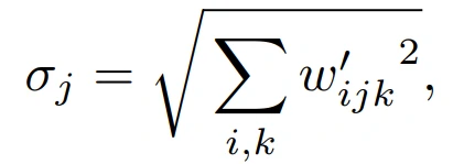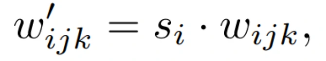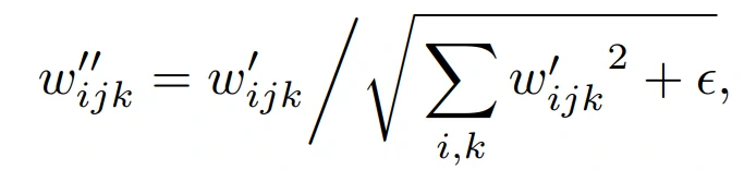 其中,w和w’分别表征原始的和modulated的权重,s_i为对应第i个输入特征图的尺度,j和k分别表示生成输出特征图和卷积的空间分布图。接着对卷积层的权重进行demod: