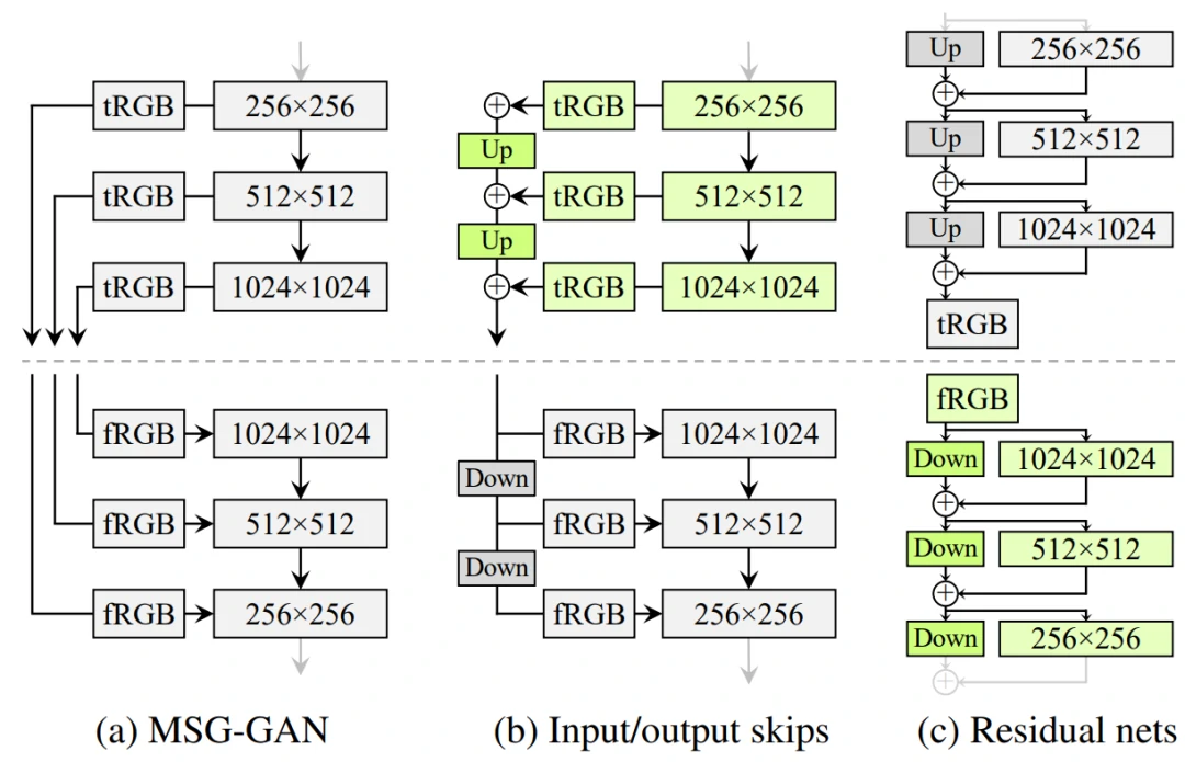 为此,作者重新评估了StyleGAN的网络设计,并寻找一种能生成高质量图像而又不会逐渐增长的架构。如图9所示,作者对比了MSG-GAN、对不同分辨率的RGB输出的贡献进行上采样和求和、残差连接。StyleGAN2采用了类似ResNet的残差连接结构(residual block),使用双线性滤波对前一层进行上/下采样,并尝试学习下一层的残差值(residual value)。通过一个resnet风格的skip connection在低分辨率的特征映射到最终生成的图像(图9(c)的绿色block)。