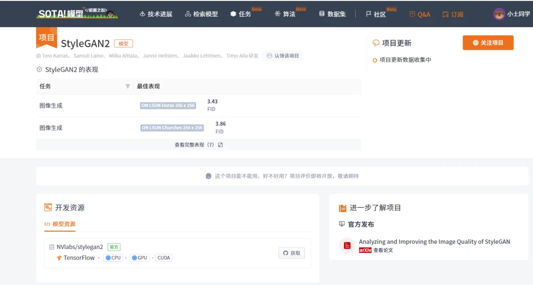 | StyleGAN2 | 前往SOTA!模型平台获取实现资源:https://sota.jiqizhixin.com/project/a07f5a80-bf97-4a33-a2a8-4ff938b1b82f |