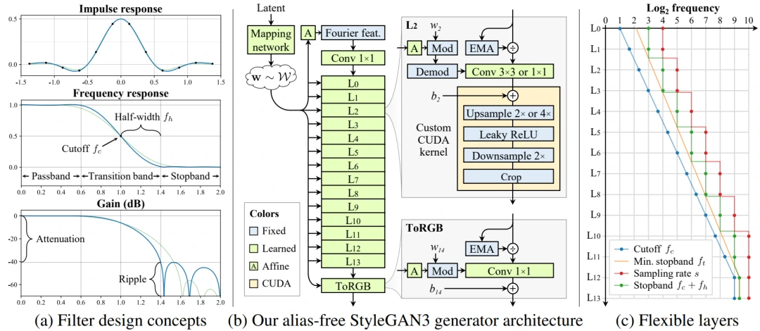 图10 (a) 2×上采样滤波器的一维例子,n = 6, s = 2, fc = 1, fh = 0.4(蓝色)。设置fh=0.6使得过渡带更宽(绿色),这减少了不需要的阻带纹波,从而导致更强的衰减。(b) alias-free生成器,对应于配置T和R。主要的数据路径包括傅里叶特征和归一化,调制卷积和过滤非线性。(c) Flexible layer specification(配置T),N=14,sN=1024。截止点fc(蓝色)和最小可接受的阻带频率ft(橙色)服从各层的几何级数;采样率s(红色)和实际阻带fc+fh(绿色)是根据设计约束计算出来的