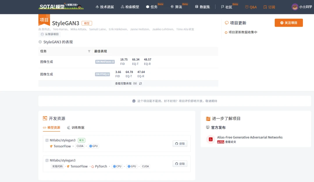 当前 SOTA!平台收录 StyleGAN3 共 2 个模型实现资源。