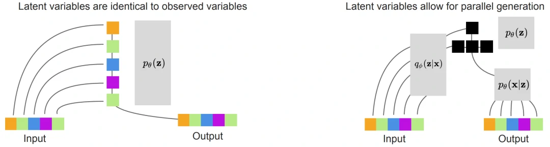 图11 在VAE中可能学到的不同生成模型。左图:一个层次化的VAE可以通过使用确定性的identity functions作为编码器来学习自回归模型,并在先验中学习自回归。右图:学习编码器可以导致潜在变量的有效分层(黑色)。如果最下面的三组潜在变量是有条件地独立于第一组潜在变量的,那么它们可以在一个单层内平行生成,可能会导致更快的采样