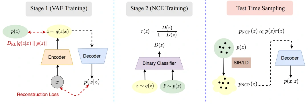 使用两阶段训练方法训练NCP,如图14。在第一阶段,使用原始VAE目标训练VAE。在第二阶段,使用噪声对比估计(noise contrast estimation,NCE)来训练重新加权因子r(z)。NCE训练一个分类器来区分来自先验的样本和来自aggregate posterior的样本。NCP是由基础先验和reweighting factor的乘积构建的,通过分类器形成。在测试时,使用采样-重要性-采样( sampling-importance-resampling ,SIR)或LD(Langevin dynamics )从NCP中采样。然后,这些样本被传递给解码器以产生输出样本。