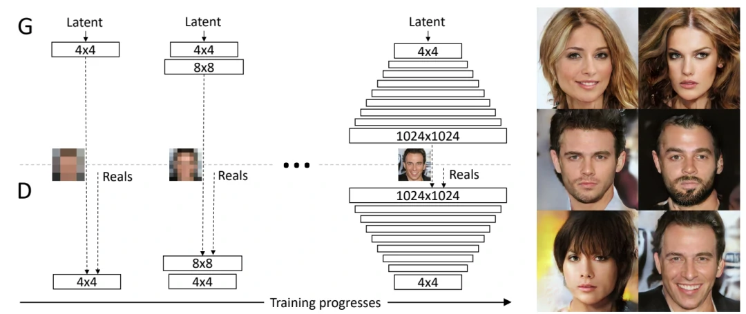 图2 训练开始时,生成器(G)和鉴别器(D)的空间分辨率都很低,只有4×4像素。随着训练的进行,逐步增加G和D的层数,从而提高生成图像的空间分辨率