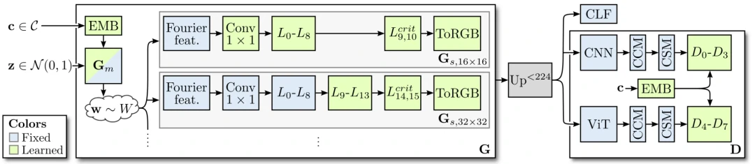 图15. StyleGAN-XL训练。将潜在编码z和类别标签c送入预训练的嵌入和映射网络G𝑚,以生成 style code w,这些code调制synthesis网络G𝑠的卷积。在训练过程中,逐渐增加层数,使渐进式增长的每个阶段的输出分辨率增加一倍。只训练最新的层,而保持其他层的固定。G𝑚只在最初的162阶段进行训练,在更高的分辨率阶段保持固定。合成的图像在小于2242时被放大,并通过一个CNN和一个ViT( Vision Transformer)以及各自的特征混合块(CCM+CSM)。在更高的分辨率下,CNN接收未经修改的图像,而ViT接收降频输入,以保持低内存要求,但仍利用其全局反馈。最后,在得到的多尺度特征图上应用八个独立的鉴别器。图像也被送入分类器CLF,用于分类器指导