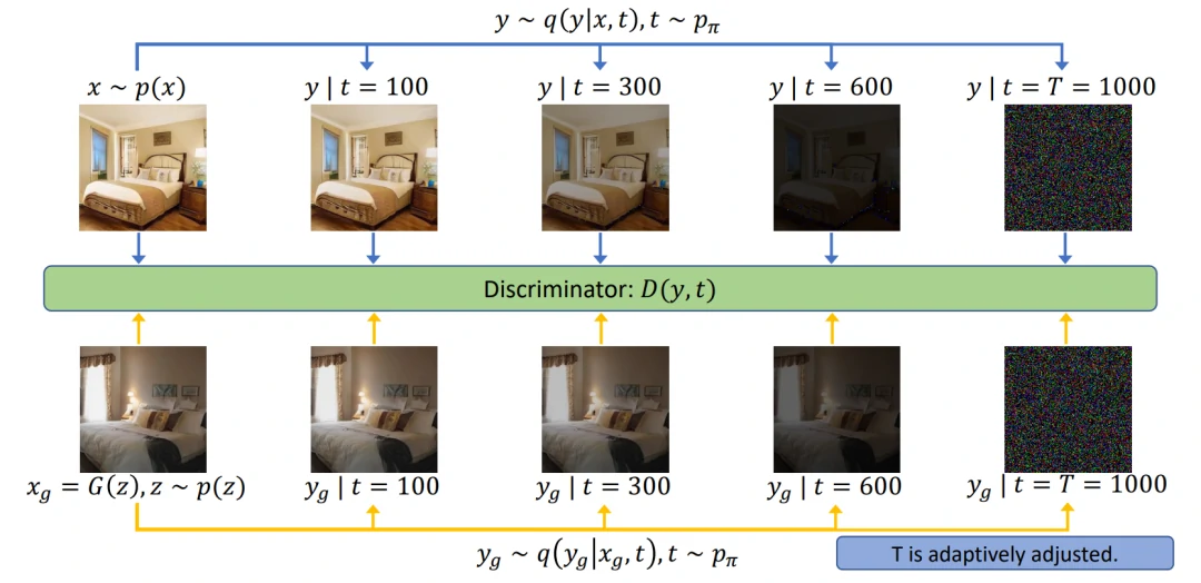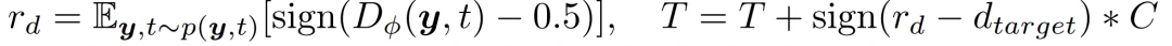 梯度可以直接反向传播到生成器。随着t的增加,y和y_g中的噪声与数据之比也在增加,从而使鉴别器D的任务越来越难。作者设计了一个扩散强度的自适应控制,以便更好地训练鉴别器。作者通过适应性地修改T来实现这一目标。我们为T设计了一个基于度量r_d的 self-paced schedule,这个schedule评估了鉴别器的过拟合度