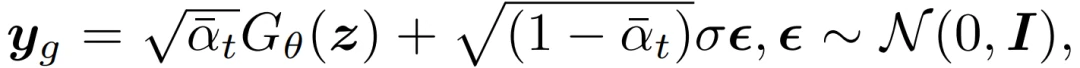 鉴别器D学习区分扩散的生成样本y_g和扩散的真实观测值y,时间为∀t∈{1, . . . , T},具体的优先级由π_t的值决定。生成器G学习将潜在变量z映射到它的输出x_g=G_θ(z),它可以在扩散链的任何一步骗过鉴别器。y_g∼q(y | G_θ(z), t)可以被重新参数化为