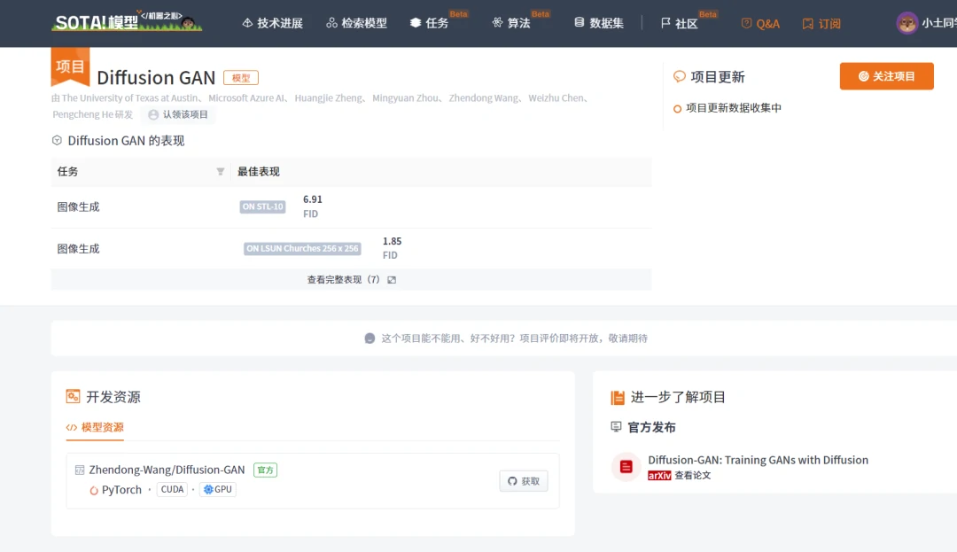 | Diffusion-GAN | 前往SOTA!模型平台获取实现资源:https://sota.jiqizhixin.com/project/9aa9b499-adec-46a3-aef9-4cd73e1c13ec |