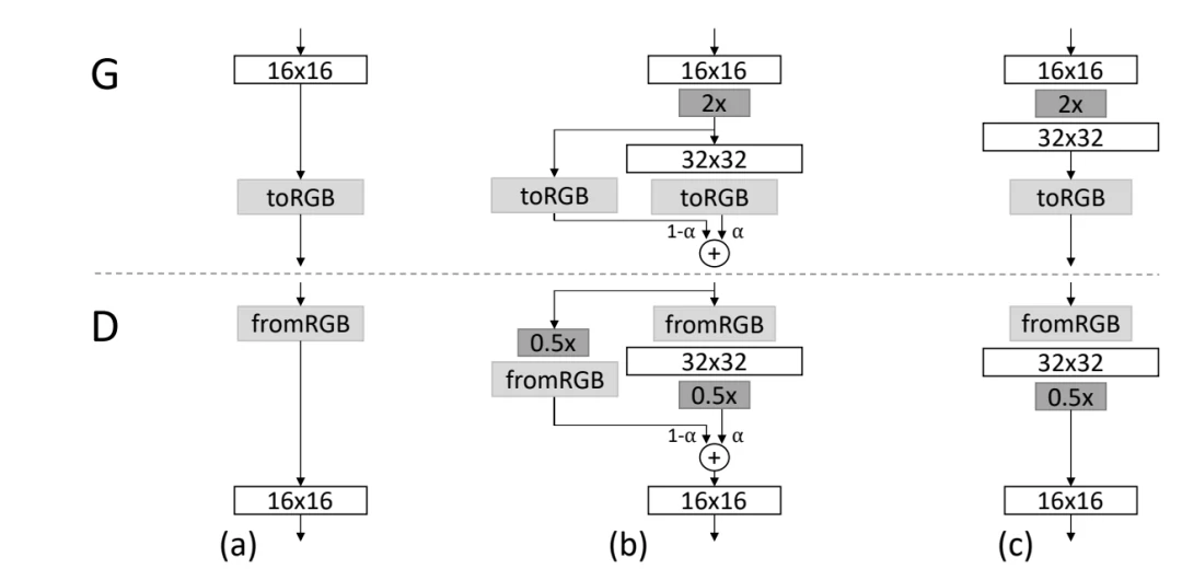 图3 当生成器(G)和鉴别器(D)的分辨率翻倍时,顺利地淡化新层。这个例子说明了从16×16图像(a)到32×32图像(c)的过渡。在过渡期间(b),把在更高的分辨率上操作的层当作一个残差块,其权重α从0到1线性增加