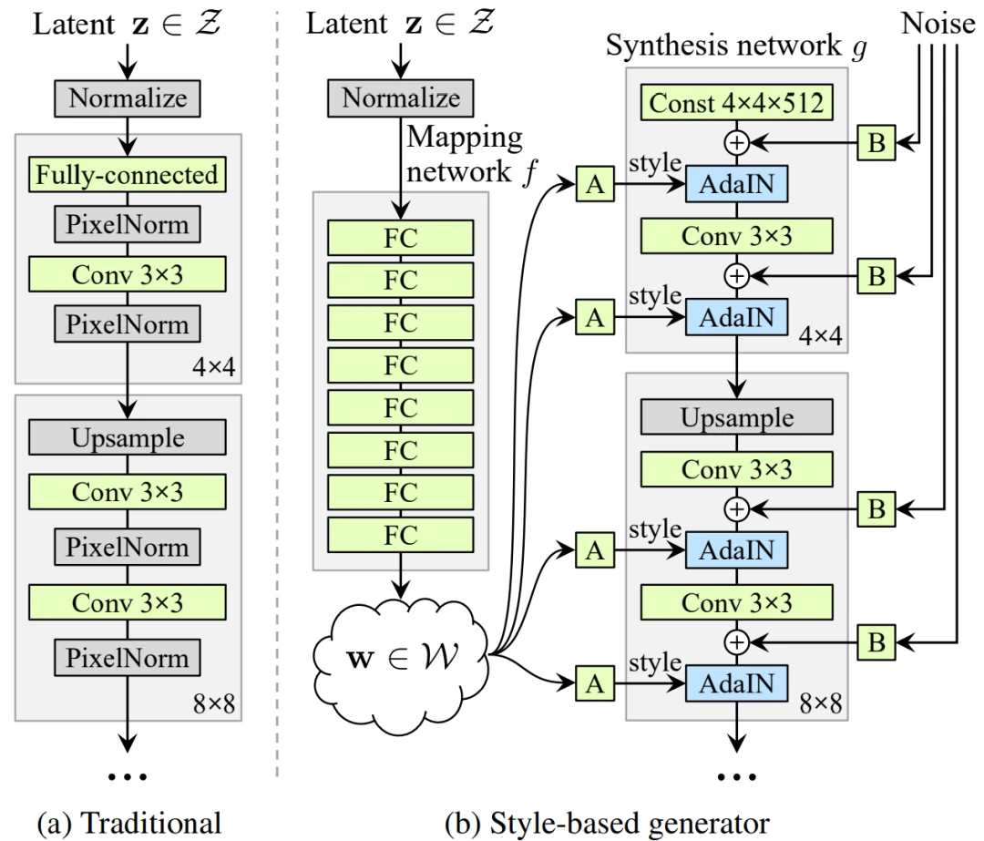 StyleGAN 的网络结构包含两个部分,第一个是Mapping network,即图 4(b)的左部分,由潜在变量 z 生成中间潜在变量 w的过程,w用来控制生成图像的style。第二个是Synthesis network,它的作用是生成图像,创新之处在于给每一层子网络都输入A 和 B,A 是由 w 转换得到的仿射变换,用于控制生成图像的style,B 是转换后的随机噪声,用于丰富生成图像的细节,即每个卷积层都能根据输入的A来调整”style”。整个网络结构还是保持了 ProGAN 的结构。经典GAN的随机变量或者潜在变量 z是通过输入层,即前馈网络的第一层提供给生成器的(图4a)。而StyleGAN完全省略了输入层,直接从一个学习的常数开始(图4b,右),即将 z 单独用 mapping网络变换成w,再将w输入给 Synthesis network的每一层。