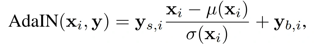 Mapping network 要做的事就是对潜在空间(latent space)进行解耦,Mapping network由8个全连接层组成,其输出与输入层的大小相同。通过一系列仿射变换,由 z 得到 w,这个 w 转换成风格y=(ys,yb) ,结合 AdaIN (adaptive instance normalization) 风格变换方法: