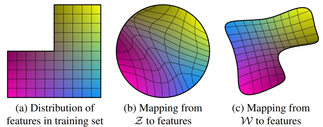 图5. 有两个变化因素(图像特征,如男性化和头发长度)的说明性示例。(a) 一个样本训练集,其中一些组合(如长发男性)是缺失的。(b) 这迫使从Z到图像特征的映射变得弯曲,以便被禁止的组合在Z中消失,以防止无效组合的采样。(c) 从Z到W的学习映射能够 “撤销 “大部分的弯曲