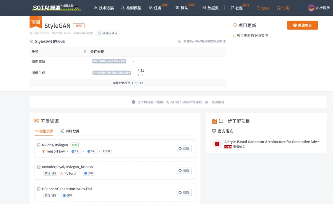 | StyleGAN | https://sota.jiqizhixin.com/project/e072cfc0-26c3-40e7-a979-60df61170c7a | A Style-Based Generator Architecture for Generative Adversarial Networks |