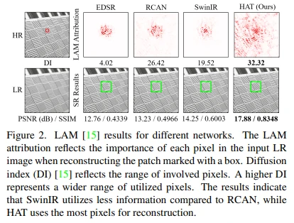 首先,这表明 SwinIR 比 CNN 具有更强的映射能力,因此可以利用较少的信息实现更好的性能。其次,由于利用的像素范围有限,SwinIR 可能会恢复错误的纹理,因此如果能够利用更多输入像素,它的性能可能进一步提升。因此,研究人员的目标是设计一种网络,既能够利用类似的自注意力机制,又能够激活更多像素进行重建。他们的 HAT 网络在图中几乎可以看到整个图像,并且能够恢复正确和清晰的纹理。