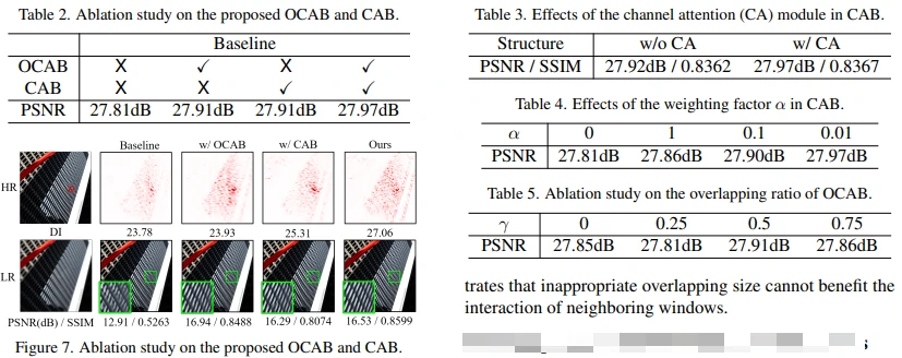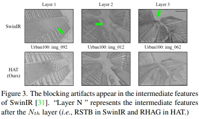此外,通过上图我们可以观察到 SwinIR 的中间特征存在明显的阻塞伪影(blocking artifacts)。这些伪影是由窗口划分机制引起的,这表明移动窗口机制在建立窗口间的连接上效率较低。一些用于高层次视觉任务的研究也指出,增强窗口之间的连接可以改善基于窗口的自注意力方法。因此,当设计本文方法时,作者特意加强了窗口间的信息交互,从而显著减轻了 HAT 所得到的中间特征中的阻塞伪影。