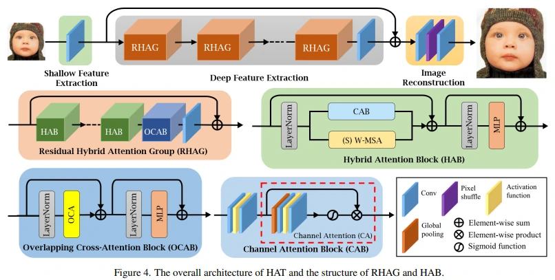 因此,为了激活更多的输入像素以实现更好的重建效果,本文构建了一种新颖的混合注意力 Transformer(HAT)方法。该方法结合了通道注意力和基于窗口的自注意力机制,充分利用它们在利用全局统计信息和强大的局部拟合能力方面的互补优势。此外,为了更好地聚合跨窗口信息,作者引入了一个重叠的交叉注意力模块,增强了相邻窗口特征之间的交互作用。在训练阶段,还采用了相同任务的预训练策略,以进一步挖掘模型的潜力以获得更好的性能。