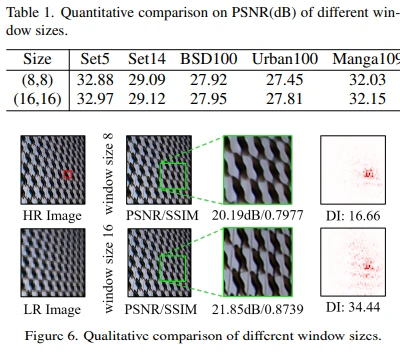 正如我们上面所讨论的,激活更多的输入像素有助于实现更好的超分辨率性能。扩大窗口尺寸是实现这一目标的直观方法。在先前的一些相关工作中,有人研究了不同窗口尺寸的影响。然而,这些实验是基于移位交叉局部注意力的,并且只探索了最大为12×12的窗口尺寸。
