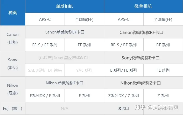 由于相机有分单反相机和微单相机两种,而依照感光元件大小又分成全画幅和APS-C画幅两种,因此排列组合下来其实应该有4种组合的相机类型(如下表)。所以,虽然同样是佳能的相机,但是却会有好几种的镜头卡口,为了大家更好理解,我们将常见的这些镜头卡口统整在下表里。
