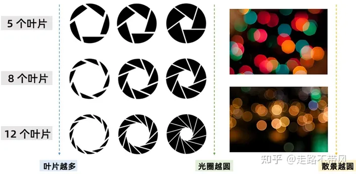 一般选购镜头不太会特别注意「光圈叶片的多少」,但是这里还是特别说明一下光圈叶片数量对于实际拍摄的影响。一般有越多的叶片所围出的光圈越圆,此时所呈现的散景也会较为圆润滑顺;反之,叶片越少则越容易有多边形的散景(如下图右上,散景为7边形)。也因此较高阶的镜头都会特别强调其叶片数量有9片或以上的原因。