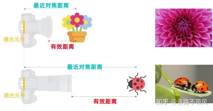 什么是最近对焦距离呢?我们以下图做解释,一般来说微距摄影为了要追求最大化主体,拍摄时会尽量靠近被摄物,所以较短的最近对焦距离自然会对微距摄影更有利。但是过短的对焦距离也有缺点,不仅采光可能被影响,还很容易会惊扰到拍摄物,因此不太适合拍摄昆虫或生物类。所以如果仅是为了拍摄静态花朵,最近对焦距离短至10cm 左右是没什么问题的,但若是为了拍摄生物,则可能要选择长焦距一点的会更适合。