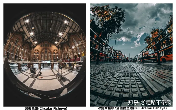 - 圆形鱼眼:最明显特色就是会影像会呈现一个成像圆,而180度的视角被压缩至这个圆圈内,所以四角的画面极为扭曲