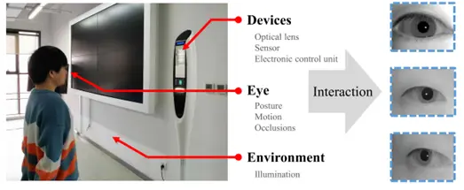 在虹膜识别技术探究的过程中,研究人员已经发现多种因素会显著的影响识别性能,例如采集距离、图像分辨率、光照、设备变更等;事实上,除了这些因素外还有其他的不确定因素在不经意地改变成像效果,进而影响算法的识别性能。具体来说,虹膜图像获取实质上是对人眼、环境和采集设备三者交互过程的单次采样,而交互中的这三大因素都会涉及大量的采集因素——人眼会涉及姿态、运动和遮挡等,环境会涉及光照等,而采集设备会涉及光学镜头、传感器等。即使是人为控制的受控场景,仍无法确保这些采集因素呈不会发生改变的确定态;换而言之,采集过程会无时不刻收到不确定采集因素的作用,而不确定采集因素对于最终成像的影响被称为采集不确定性。