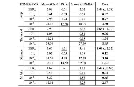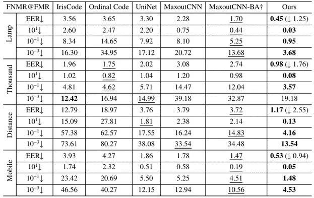 本文所提方法在CASIA-irisV4-Lamp、CASIA-irisV4-Thousand、CASIA-irisV4-Distance 和 CASIA-iris-Mobile-V1四个同设备数据集上进行了库内和跨库两种设定的测试。表一和表二分别展示了在库内和跨库两种设定下的性能对比