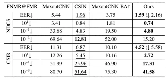 跨设备识别是相较于同设备识别更具挑战性的识别难题,该任务需要算法使用某一型号的设备来进行用户注册,然后使用另外型号的设备来进行用户识别。本文在ND-CrossSensor-Iris-2013和CASIA Cross Sensor Iris Recognition两个数据集上进行了库内和跨库两种设定的识别。表三和表四分别展示了算法在库内和跨库两种设定下的识别结果。