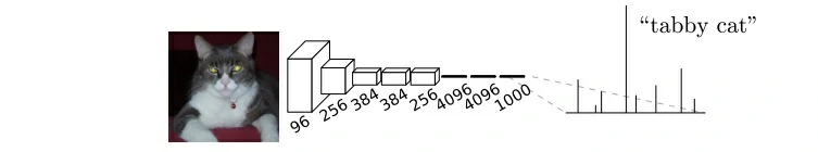 下图中的猫, 输入 AlexNet, 得到一个长为 1000 的输出向量, 表示输入图像属于每一类的概率, 其中在 “tabby cat” 这一类统计概率最高。