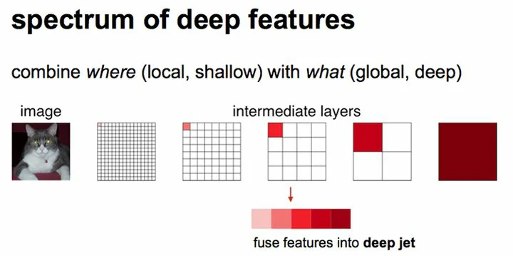 这里就涉及到一个感受域(receptive field)的概念。较浅的卷积层(靠前的)的感受域比较小,学习感知细节部分的能力强,较深的隐藏层(靠后的),感受域相对较大,适合学习较为整体的、相对更宏观一些的特征。所以在较深的卷积层上进行反卷积还原,自然会丢失很多细节特征。